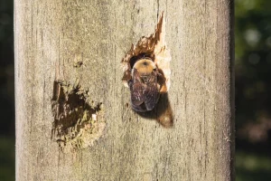 Carpenter bees are like tiny woodworkers. They love to burrow into wood—think fences, decks, or even trees! They create round holes in the wood to lay their eggs. Each hole becomes a little room where they store nectar and pollen for the larvae. Carpenter bees are solitary (they don’t live in big groups like honey bees), but they can cause damage over time by drilling into wooden structures. They don’t eat the wood; they just create homes inside it!