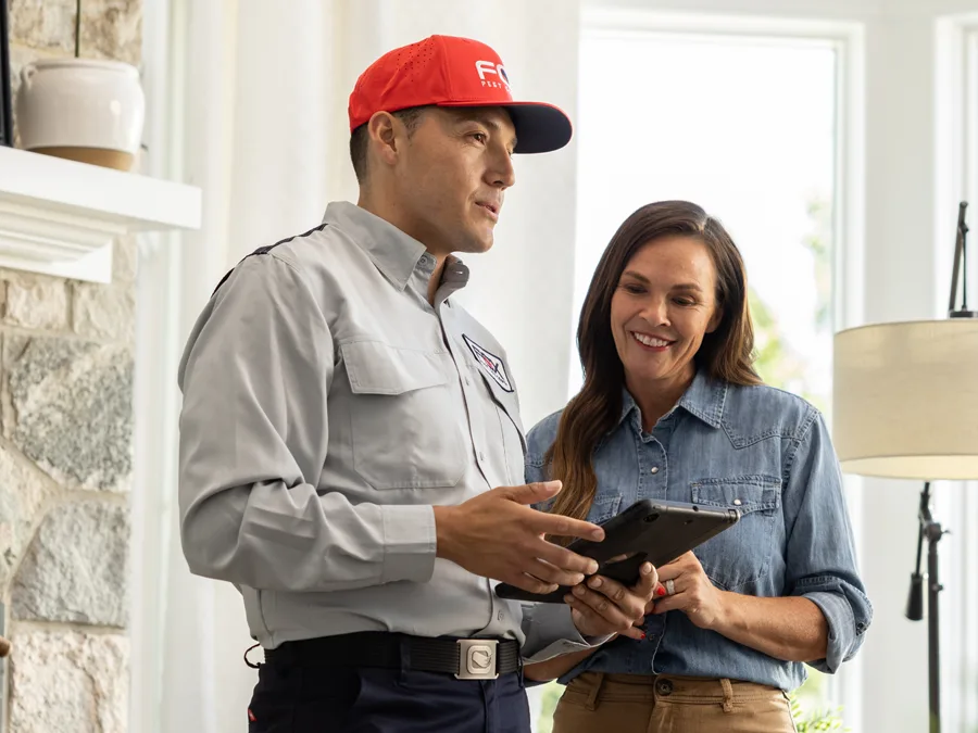 Fox Pest Control technician talking to female customer