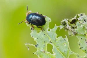 Appearance: Leaf beetles are usually small and oval-shaped with smooth, shiny bodies. They come in all kinds of colors, like bright green, yellow, and even cool metallic shades. Some types even have unique patterns or markings on their wing covers.