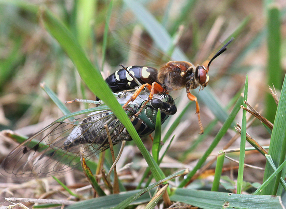 Adult cicada killers drink flower nectar, but their larvae get a heartier meal – that’s right, cicadas! After she’s burrowed a tunnel for her eggs, the female goes hunting for cicadas. Once she captures her prey, she stings it, and her venom paralyzes it. She then carries it back to her burrow and puts it into one of the cells or rooms. She lays one egg in each cell and then seals the chamber. The eggs will hatch in 2-3 days, and the larvae will begin feeding on the cicada.